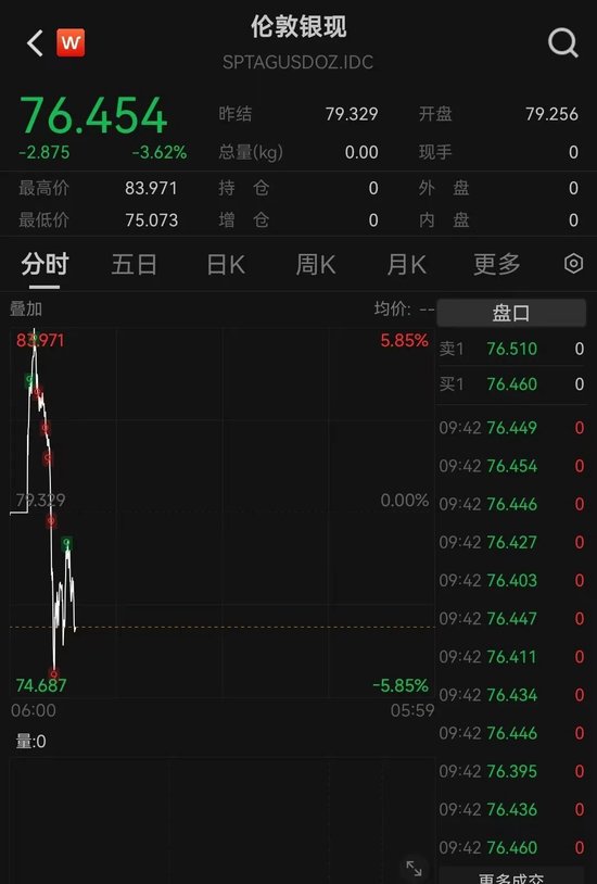 12月29日,实物白银大幅下跌,最大跌幅超过5%。此前该股已上涨近 6%,接近 84 美元的水平。截至撰写本文时,跌幅已收窄,目前交易价格为每盎司 76.454 美元。